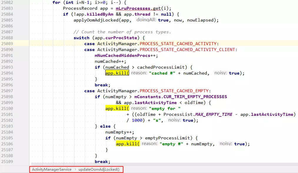 在 ActivityManagerService 调用 updateOomAdjLocked() 时,会判断进程是否需要被杀死,若是,则调用 ProceeRecord::kill() 方法杀死该进程: