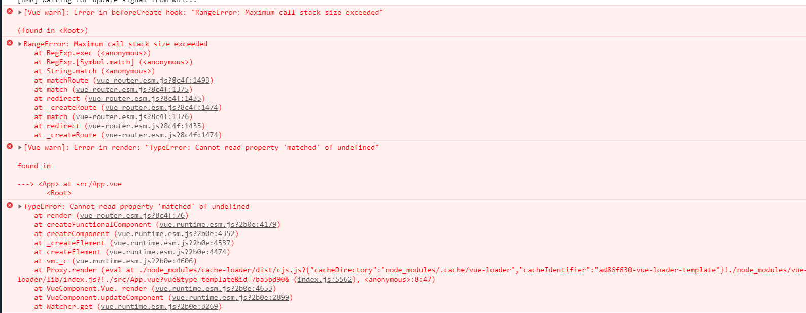 上面关于404页面的定义顺序非常重要,如果在静态路由中定义了捕获的路由path:"*",而在动态路由中定义了404路由的话,则当导航钩子中判断比较复杂的话,会出现一些意想不到的错误,我就是当时写反了顺序,并且还在导航钩子中做了一些复杂的面包屑的判断,一旦刷新页面的话,则会出现以下错误