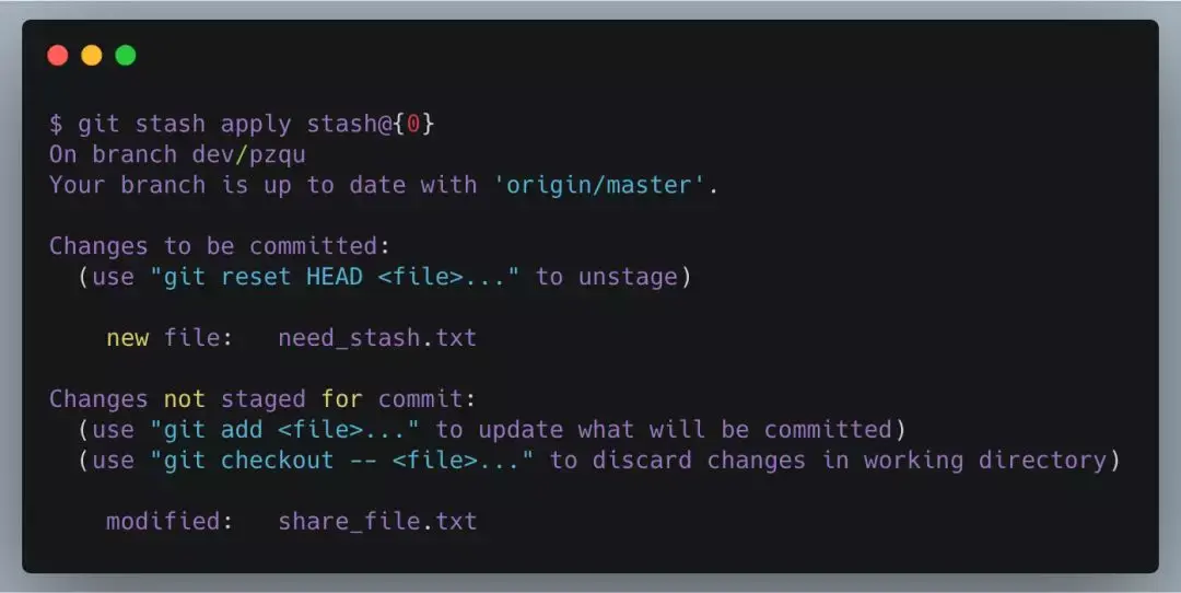 git stash list列出暂存区所有记录,如果有多次暂存就会有多条记录git stash apply stash@{0}把暂存区的记录恢复到本地git stash drop stash@{0}精准删除暂存记录或者git stash pop恢复的同步删除最后一条暂存记录