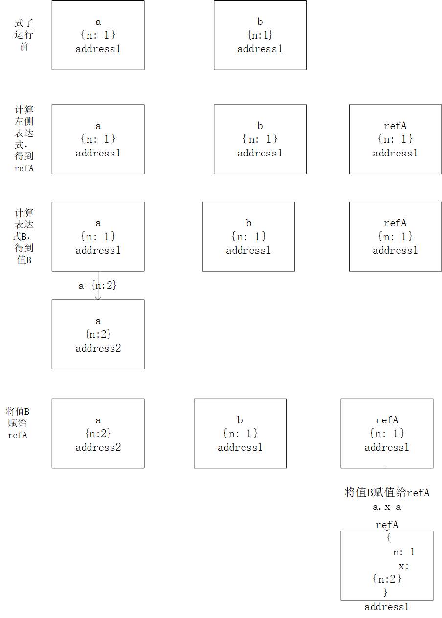 - 计算左侧的refA,此时右侧表达式还未运行,a的引用还没有改变和b指向同一个对象,为了方便我们把这个refA的值记为地址address1