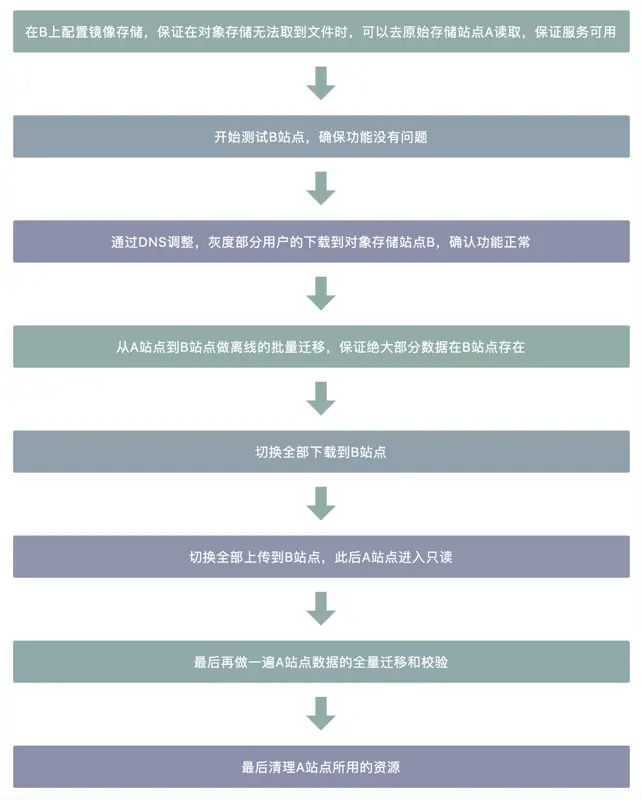 除此之外,对象存储服务还能提供完全无缝的迁移方案,利用镜像存储等功能,可以做到在迁移时,终端用户完全无感知。比如从原始存储站点A迁移到对象存储B,一般步骤如下: