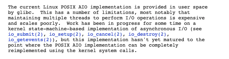 注意:这只是 POSIX(The Portable Operating System Interface)定义的接口,并不是实现。Linux 内核对异步 IO 的具体实现在后面。(This is an API, not implementation!)