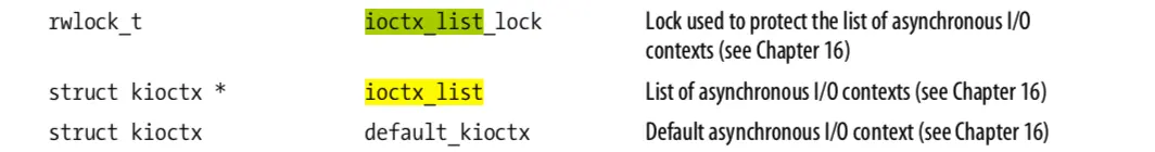 基本上来说,一个 AIO context 就是一个用于追踪所有进行中的异步IO操作的数据结构,这个 struct 叫做kioctx。一个应用可能会创建多个 AIO context,一个进程的所有kioctx用一个链表相连:ioctx_list。