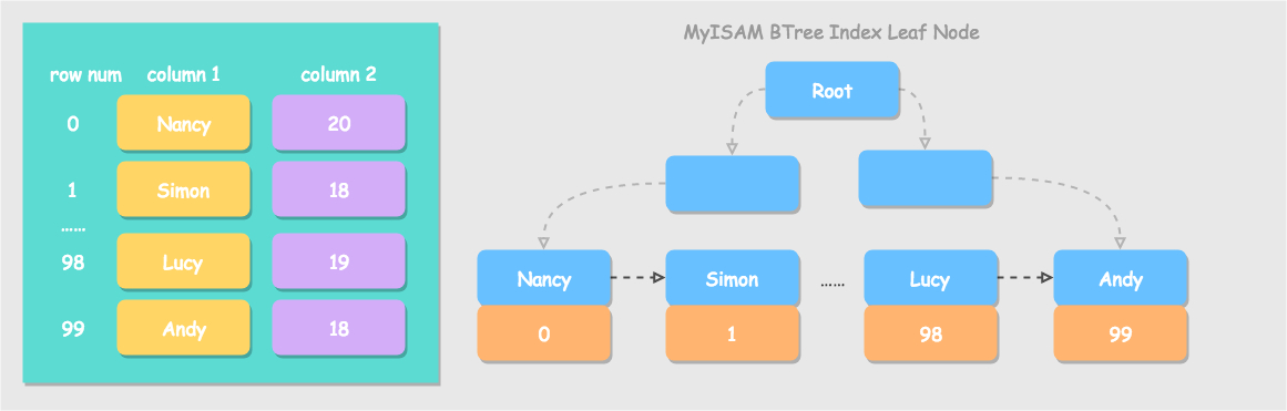 MyISAM 存储引擎的索引文件和数据文件是分开的,MyISAM 引擎按照数据插入顺序,将数据文件存储在磁盘上,例如下图中 99 条记录从上到下依次存储。MyISAM 引擎使用 B+ 树作为索引结构,叶节点存放的是数据记录的行指针,图中为了方便阅读以行号代替。