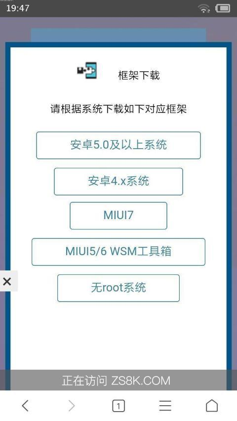如果你的系统是5.0或5.0以上的系统版本,请选第一项"安卓5.0及以上系统"安装激活即可,如果系统是5.0以下版本,请选第二项“安卓4.x系统”进行安装即可,如果系统是miui7系统版本,则请选第三项“MIUI7”进行安装激活,miui5/6则安装wsm框架即可,注意以上各个版本都需要在Root前提下进行激活,如果刚好你的系统不能够获得Root权限,可尝试安装“无Root系统”版本的框架。