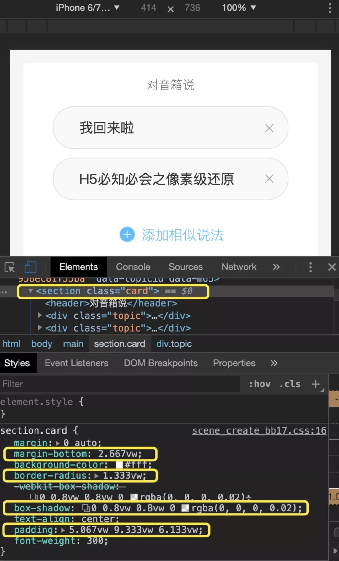 没错,所有这些px值都从设计稿中实测得到的(事实上是标注页面自动给出的)。而经过postcss-px-to-viewport插件转换之后,可以看到这些值都被转换成了相对于视口宽度的 vw单位: