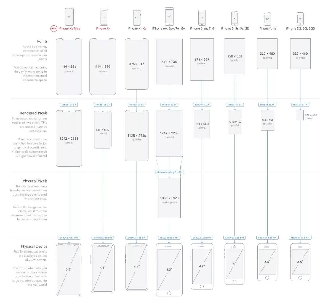 像素密度,顾名思义就是CSS中的1像素对应多少物理像素。我们以这张iPhone各代屏幕对照图(来源:https://www.paintcodeapp.com/news)为例: