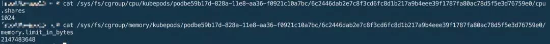 在运行该容器的宿主机上查看该容器的cgroup信息,会观察到cpu.shares为1核,memory.limit_in_bytes为2G。