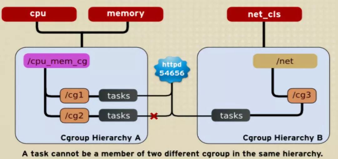 如下图,cpu和memory被附加到cpu_mem_cg的hierarchy。而net_cls被附加到net_cls hierarchy。并且httpd进程被同时加到了cpu_mem_cg hierarchy的cg1 cgroup中和net hierarchy的cg3 cgroup中。并通过两个hierarchy的subsystem分别对httpd进程进行cpu,memory及网络带宽的限制。