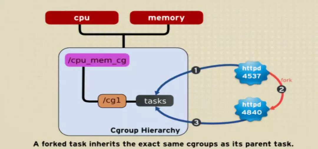如下图,httpd进程在cpu_and_mem hierarchy的/cg1 cgroup中并把PID 4537写到该cgroup的tasks中。之后httpd(PID=4537)进程fork一个子进程httpd(PID=4840)与其父进程在同一个hierarchy的统一个cgroup中,但是由于父task和子task之间的关系独立不依赖的,所以子task可以移到其它的cgroup中。