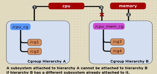 如下图,cpu subsystem已经附加到了hierarchy A,并且memory subsystem已经附加到了hierarchy B。因此cpusubsystem不能在附加到hierarchy B。