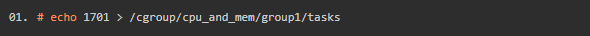 只要将想要限制的进程PID,追加到想要的cgroup的tasks文件中就可以了。例如:将PID=1701的进程放到“/cgroup/cpu_and_mem/group1/”的cgroup中。