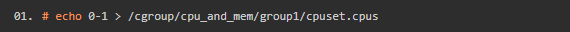 在group1中使用echo命令插入0-1到cpuset.cpus,来限制该cgroup中的tasks只能跑在0和1的cpu core上。如下: