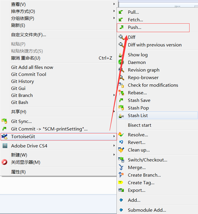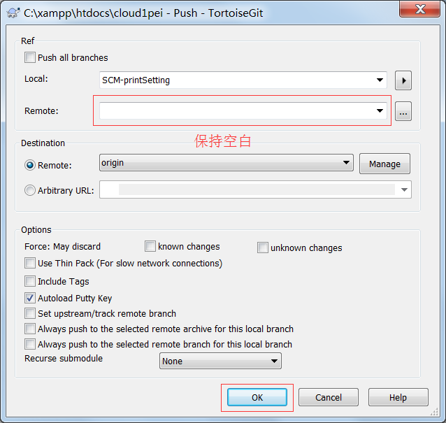 第三步:在新分支下执行PUSH操作,在对话框中保持远程分支为空白,点击OK,则将在远程创建了新的分支(在PUSH的时候远程服务器发现远程没有该分支,此时会自动创建一个和本地分支名称一样的分支,并将本地分支的内容上传到该分支)。