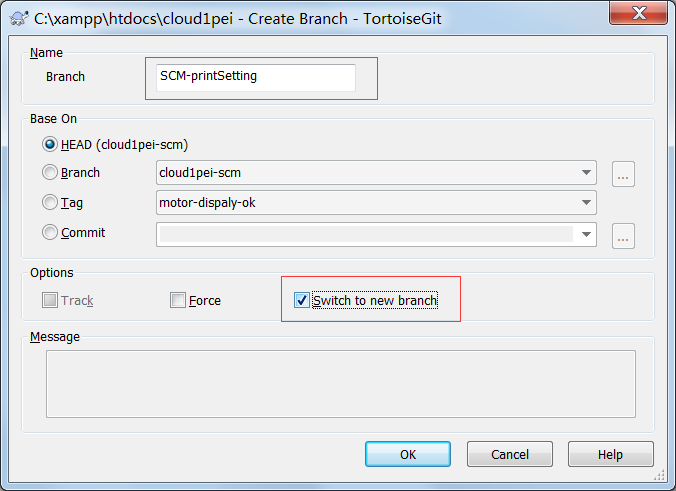 点击右键选择TortoiseGit,选择Create Branch…,在Branch框中填写新分支的名称(若选中”switch to new branch”则直接转到新分支上,省去第二步),点击OK按钮: