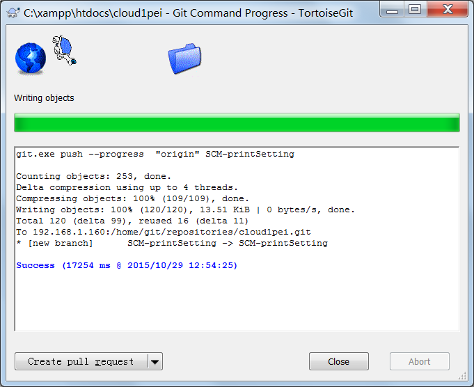 分支合并成功后,我们即可以通过Commit与PUSH操作将合并上传到中心服务器。