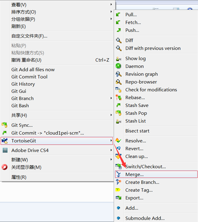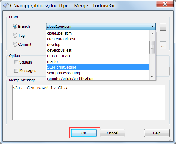 进行分支合并之前我们需要明确哪个分支将要合并到哪个分支,首先通过“Switch/CheckOut”切换到主干分支(如develop分支),然后通过“Merge”继进行合并操作,在对话框中选择需要合并的分支。