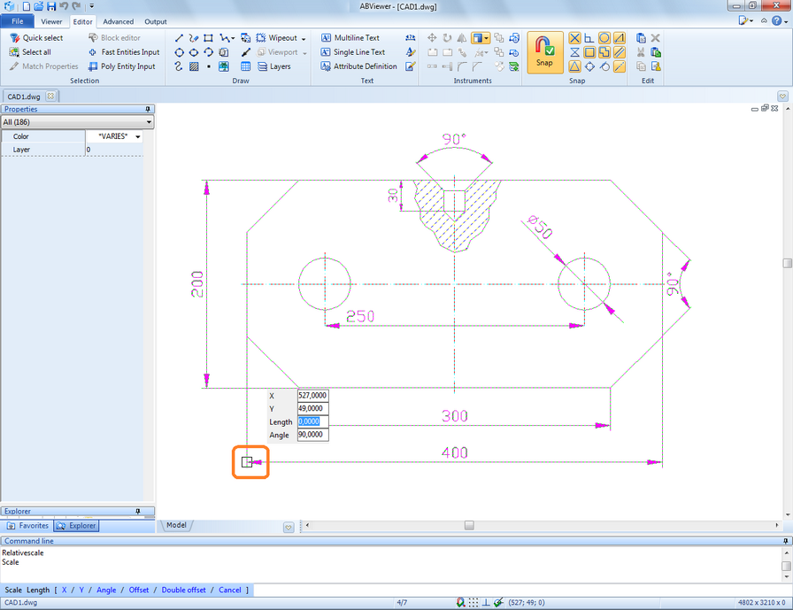 “ 缩放” 按钮允许按比例更改所选实体的大小。可参加下述例子: