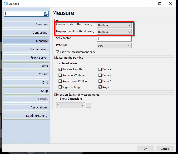 因此,如果您想使用真实世界单位进行测量(比方说,英寸),您应该假设通过在“选项”对话框窗口中设置相应的值,原始绘图单位也是真实世界单位(例如,毫米),然后将显示的单位设置为所需的值(英寸)。