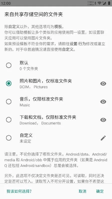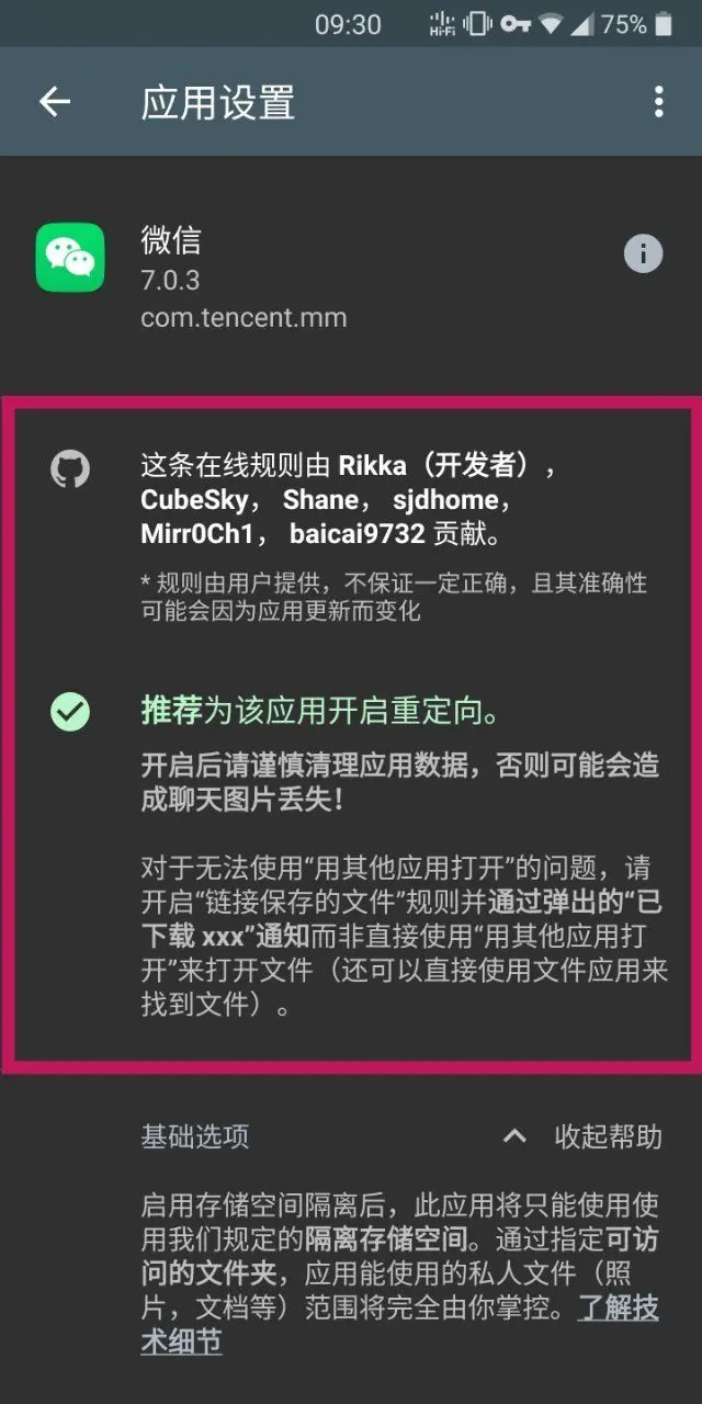 这一部分决定了被隔离的应用能够访问哪些共享存储空间目录。如果你喜欢用微信分享音乐,在为微信启用重定向后,可能就需要允许微信访问来自共享存储空间的 /Music 文件夹。