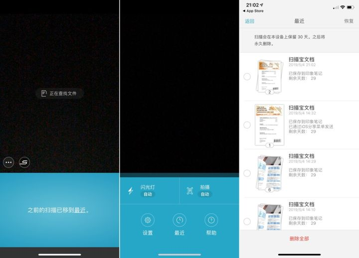 另外,扫描宝所谓的「查看最近」也仅仅是当你在印象笔记中误删文件后给你一个恢复的机会(三十天后会自动删除,并且在恢复时可以重新调整和裁剪扫描文件),所以你甚至都不能在扫描宝里直接查看文件。