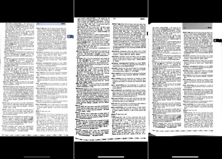 为了让大家有一个更直观的印象,我用扫描宝、iOS 自带扫描工具和 Scanner Pro 在同光线同背景下扫描同一份文档的结果给大家参考。值得一提的是,当我扫描内容复杂的牛津词典的时候,只有 Scanner Pro 可以做到自动识别文档并拍照,另外两个都需要我在拍照后手动裁剪截取画面。