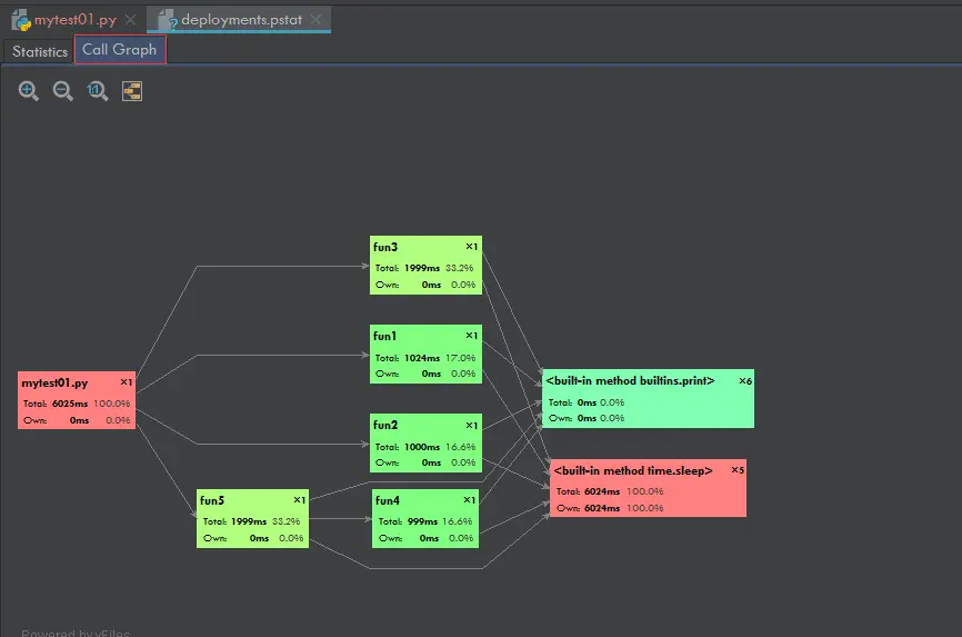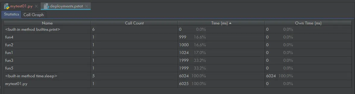 - 从图中可以看出Test.py直接调用了fun3、fun1、fun2和fun5函数;fun5函数直接调用了fun4函数;fun1、fun2、fun3、fun4和fun5都直接调用了print以及sleep函数;整个测试代码运行的总时间为6006ms,其中fun3的运行时间为1999ms,所占的时间百分比为33.3%,也就是 1999ms / 6006ms = 33.3%。