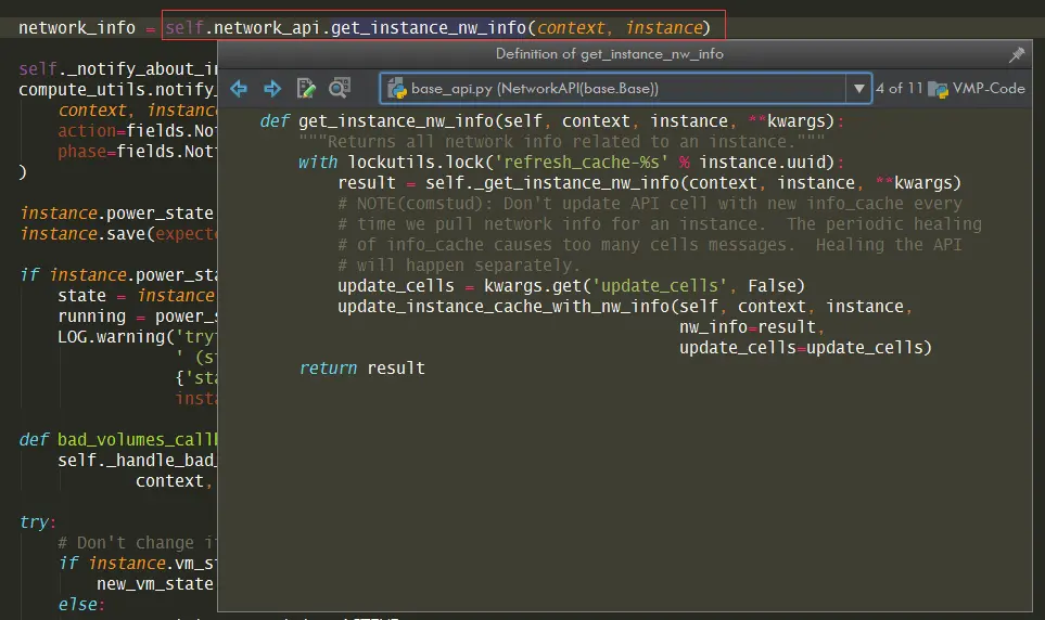 同样的,如果你对这个类或者函数的代码逻辑感兴趣,也可以使用快速预览的方式在当前页面展示源代码。快捷键是:Ctrl + shift + i (Mac:Command + shift + i)。效果如下