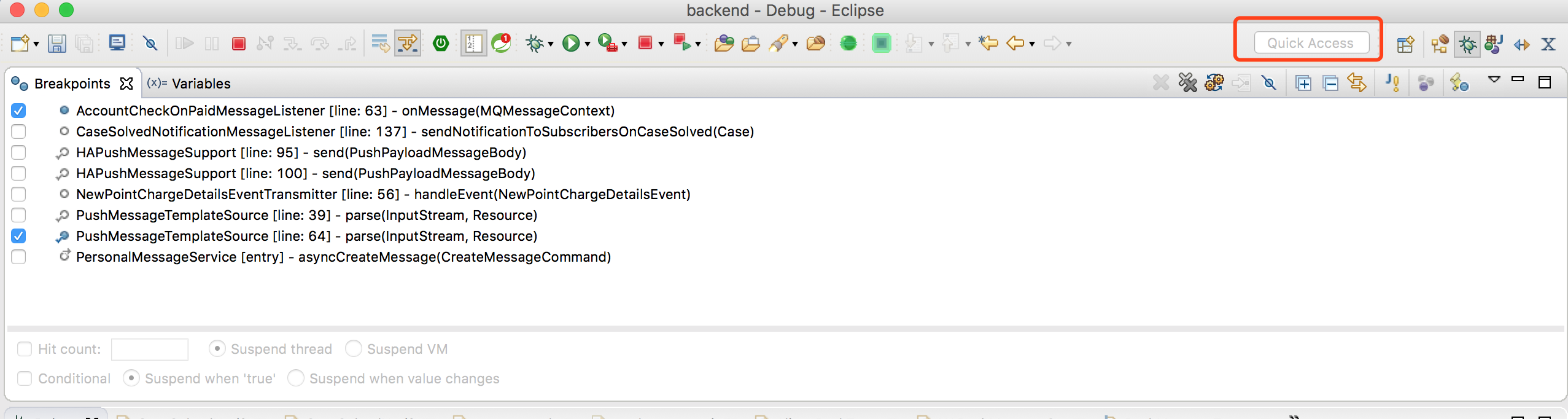 以debug方式运行java程序后,跳转到调试视图,其中最常用的窗口有:Debug窗口,变量Variables窗口,断点Breakpoints窗口,代码编辑窗口,输出Console窗口,大纲outline窗口。Debug窗口显示当前线程方法调用栈,及方法执行到第几行,Variables显示当前方法的局部变量,非静态的变量等,可以修改变量值,Breakpoints可用来新增和删除断点等,Console控制台用于查看打印的日志信息。