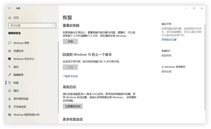 到了 2019 年,Windows 7 都已经停止支持了,Windows 10 在这方面已经取得了长足的进步。微软在 Windows 10 中提供了很多还原系统的方法,你可以把微软官网的 Windows 10 中的恢复选项这篇文章收藏下来,如果将来出现了问题,可以按照这张表查询,根据文中详细的解决方法来处理。