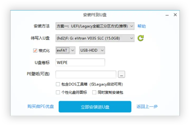 多数 PE 系统都有一个简单快捷的安装器,只要插上 U 盘,打开安装器进行安装即可。以微 PE 为例,打开安装器后选择安装在 U 盘的图标,就可以一键安装进 U 盘了。