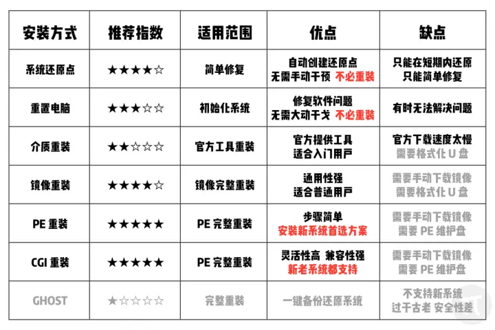 本文给出了 7 种重装 Windows 系统的相关方法以及对它们的评价,我整理了一份表格,让大家更直观地对比这些方法的优劣,最推荐的两个方法无疑是通过 PE 和 CGI 来实现重装系统。