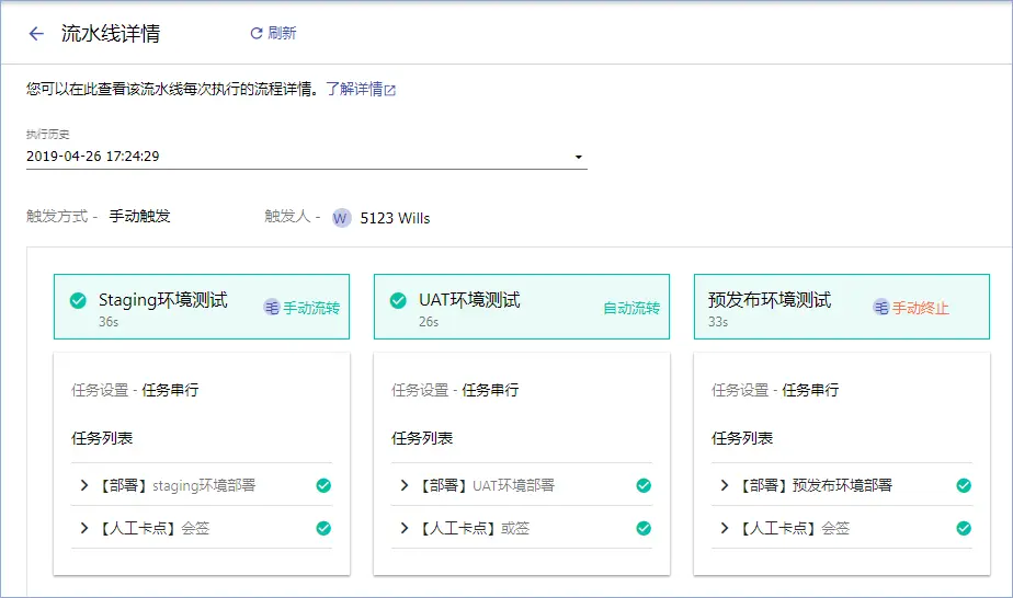 - 部署流水线模块新增流水线的功能,支持在流水线中创建多个阶段,且每个阶段中可添加多个任务,包括自动部署任务与人工卡点任务。
