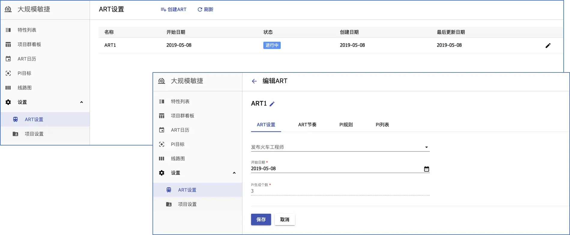 - 新增项目群ART设置,支持创建、修改、开启、停用ART,以及ART下的PI列表的展示。这是项目所有者对大规模敏捷项目的一些设置,包括敏捷发布火车设置、项目编码以及工作日历设置。