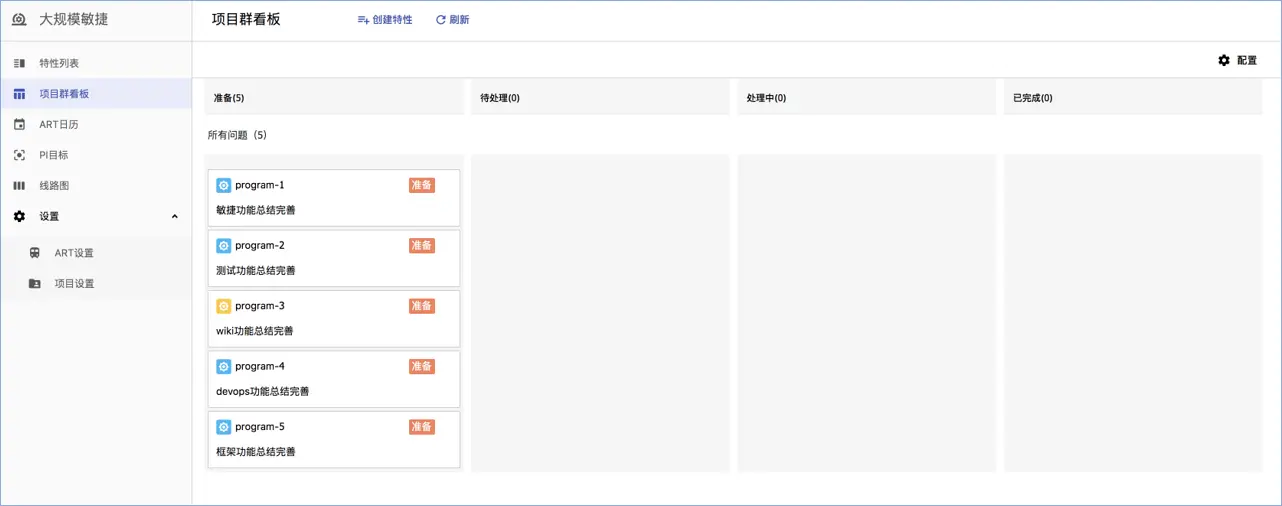 - 新增项目群看板,支持特性的移动、展示等。不同于团队的看板,关注的是一个冲刺的用户故事,项目群看板则关注的是全部的特性。