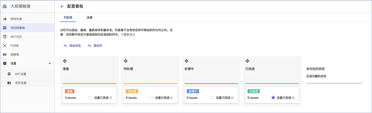 - 新增项目群看板的配置,包括列与状态的配置。
