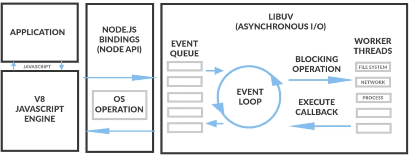 Nodejs 首先将 JavaScript 写好的应用程序交给 V8 引擎进行解析,V8理解应用程序的语义后,再调用 Nodejs 底层的 C/C++ API将服务启动起来。 所以 Nodejs 的强大就在于 js 可以直接调用 C/C++ 的方法,使其能力可以无限扩展。
