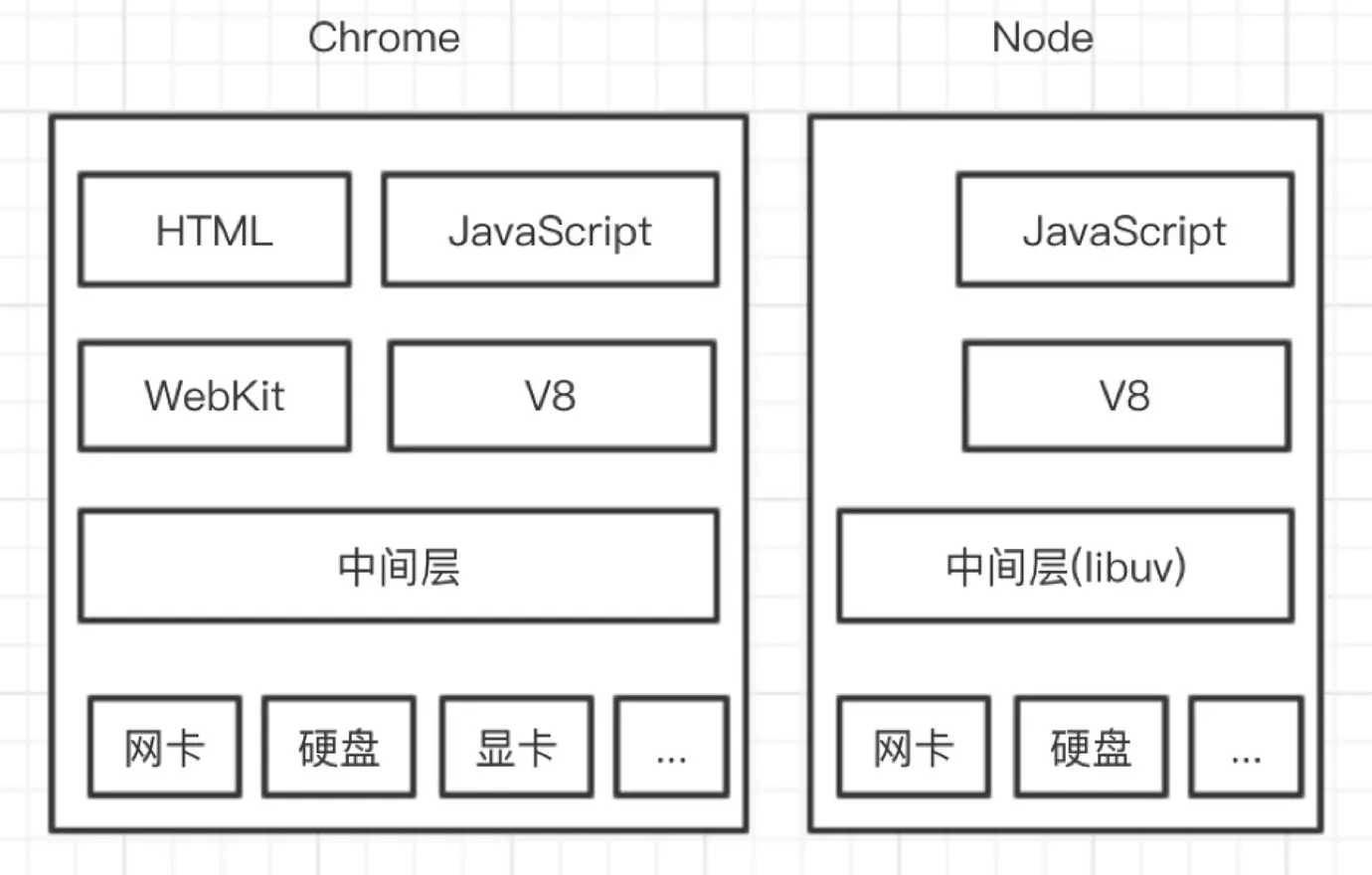 对于使用 Nodejs 的新手来说,很容易出现思维混乱,因为在服务端至少要放两个 JS 脚本。其中一个是服务端程序,控制 Nodejs 的行为,它由 Nodejs 的V8引擎解析处理;另一个是客户端程序,它是要由浏览器请求后,下发到浏览器,由浏览器中的 V8 引擎进行解析处理。如果分不清这个,那麻烦就大了。