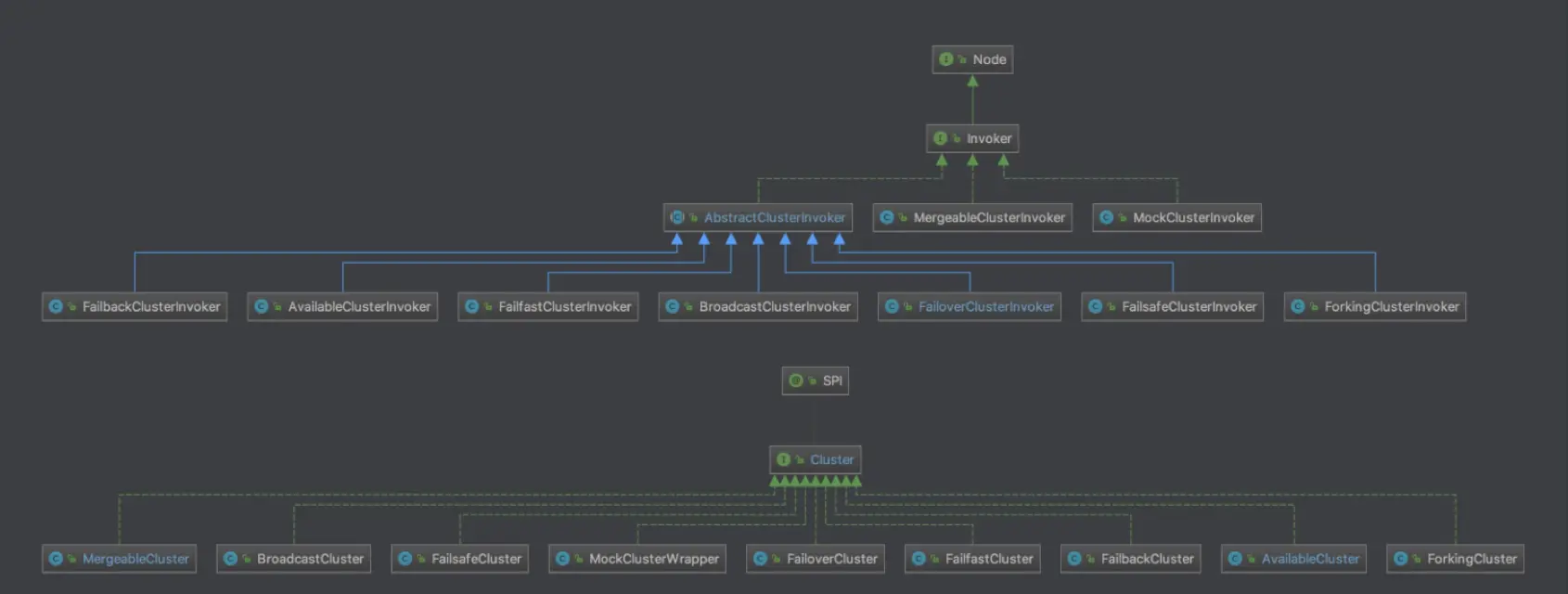 从上图可以看到,每一个Cluster实现都对应一个Invoker实现。