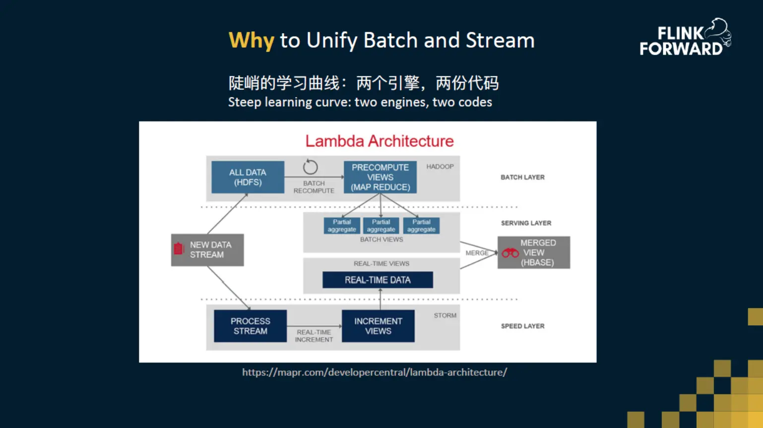 但是这个架构有很多问题,比如用户需要学习两套引擎的开发方式,运维需要同时维护两套系统。更重要的问题是,我们需要维护两套流程,一套增量流程,一套全量流程,同时这两套流程之间必须要有一定的自洽性,它们必须要保证一致。当业务变得越来越复杂的时候,这种一致性本身也会成为一个挑战。