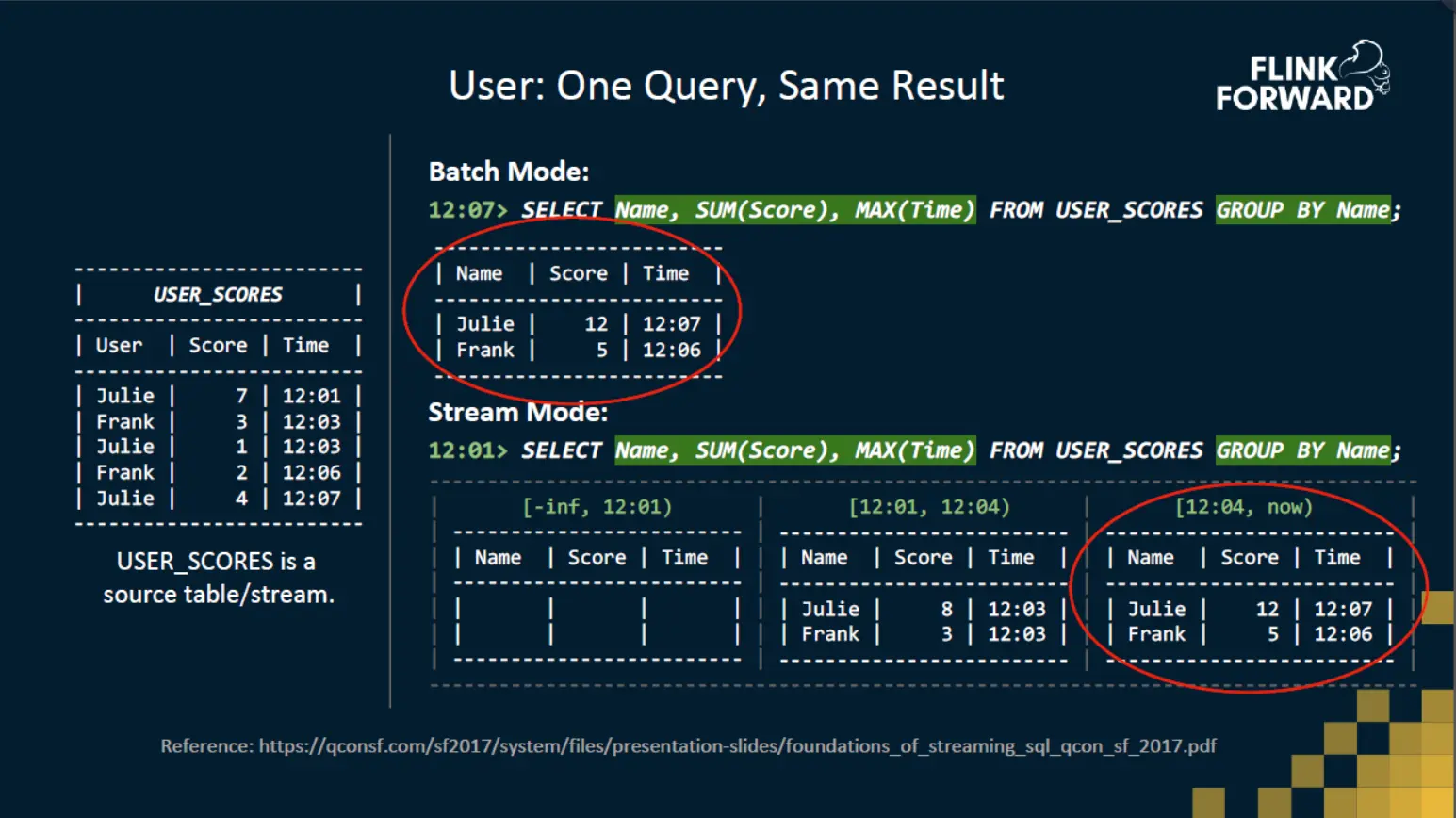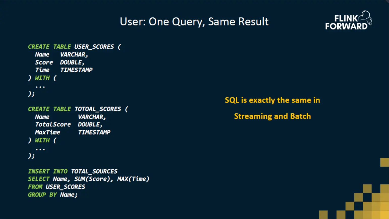首先我们有一张用户的分数表 USER_SCORES,里面有用户的名字、得分和得分时间。通过这张表来做一个非常简单的统计,统计每个用户的总分,以及得到这个分数的最近时间是多少? 从流计算跟批处理的角度,不管是做一张离线报表,还是实时不断地产出计算结果,它们的SQL是完全一模一样的,就是一个简单的GroupBy分组,求和,求max。