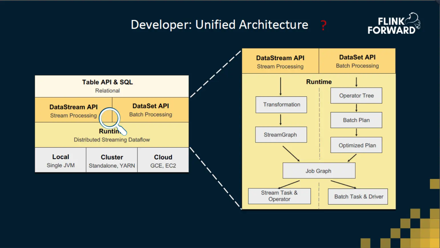 对于开发人员来说,引擎的统一又是意味着什么?这张图是目前Flink的架构图,最上层 Table API 与 SQL。在执行之前,会根据执行环境翻译成 DataSet 或 DataStream 的 API。这两个 API 之间还是有比较大的不同,我们可以放大之后看看。比如 DataSet API 是Flink批处理的API,它自己有一个优化器。 但是在DataStream API下,就是一些比较直观简单的翻译。然后在运行时,他们也是依托于不同的task。在 DataStream 这边,主要是运行Stream Task,同时在里面会运行各种各样的operator。 在批处理这边主要是运行 Batch Task 和 Driver。这个主要是执行模式的区别。