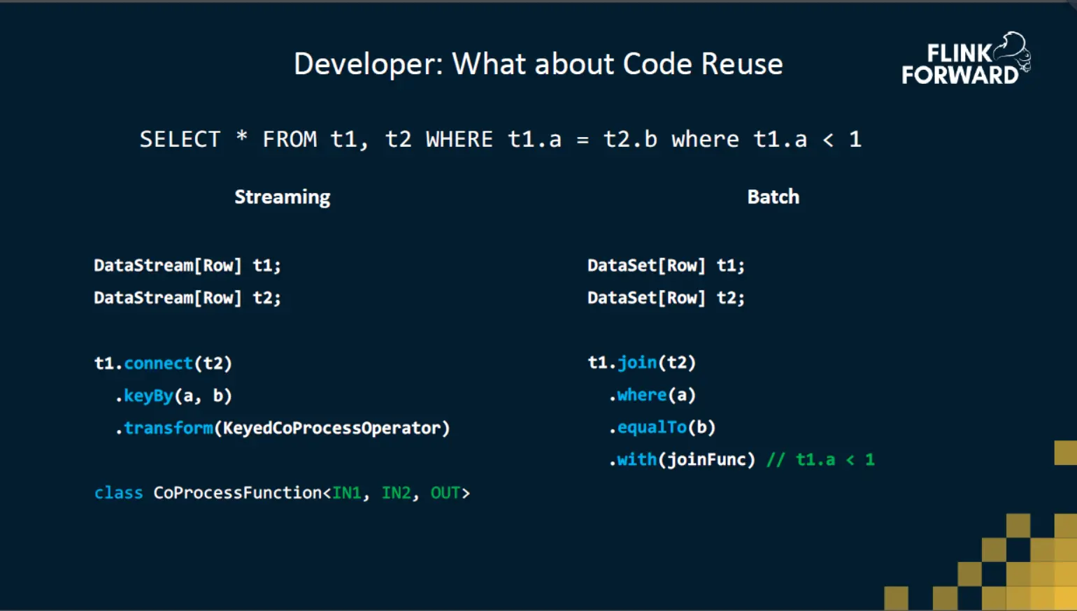 在代码上能有多少能共用的呢?比如说要实现一个 INNER JOIN,以现在的代码距离,如果要在流上实现 INNER JOIN,首先会把两路输入变成两个DataStream,然后把两个输入 connect 起来,再进行 keyBy join key,最后实现一个 KeyedCoProcessOperator 来完成 join 的操作。但是在 DataSet 这边,你会发现 API 就不太一样了,原因是 DataSet 底下是有个优化器的。换句话说,DataSet 的 API 有些是声明式的,DataStream 的 API 是命令式的。从这个例子上来看,对于我们开发人员来说,在流计算或者是在批处理下实现 JOIN 所面对的 API 其实是比较不一样的,所以这也很难让我们去复用一些代码,甚至是设计上的复用。这个是API 上的区别,到了Runtime之后,比较大的不同是 Stream Task 跟 Batch Task 的区别。
