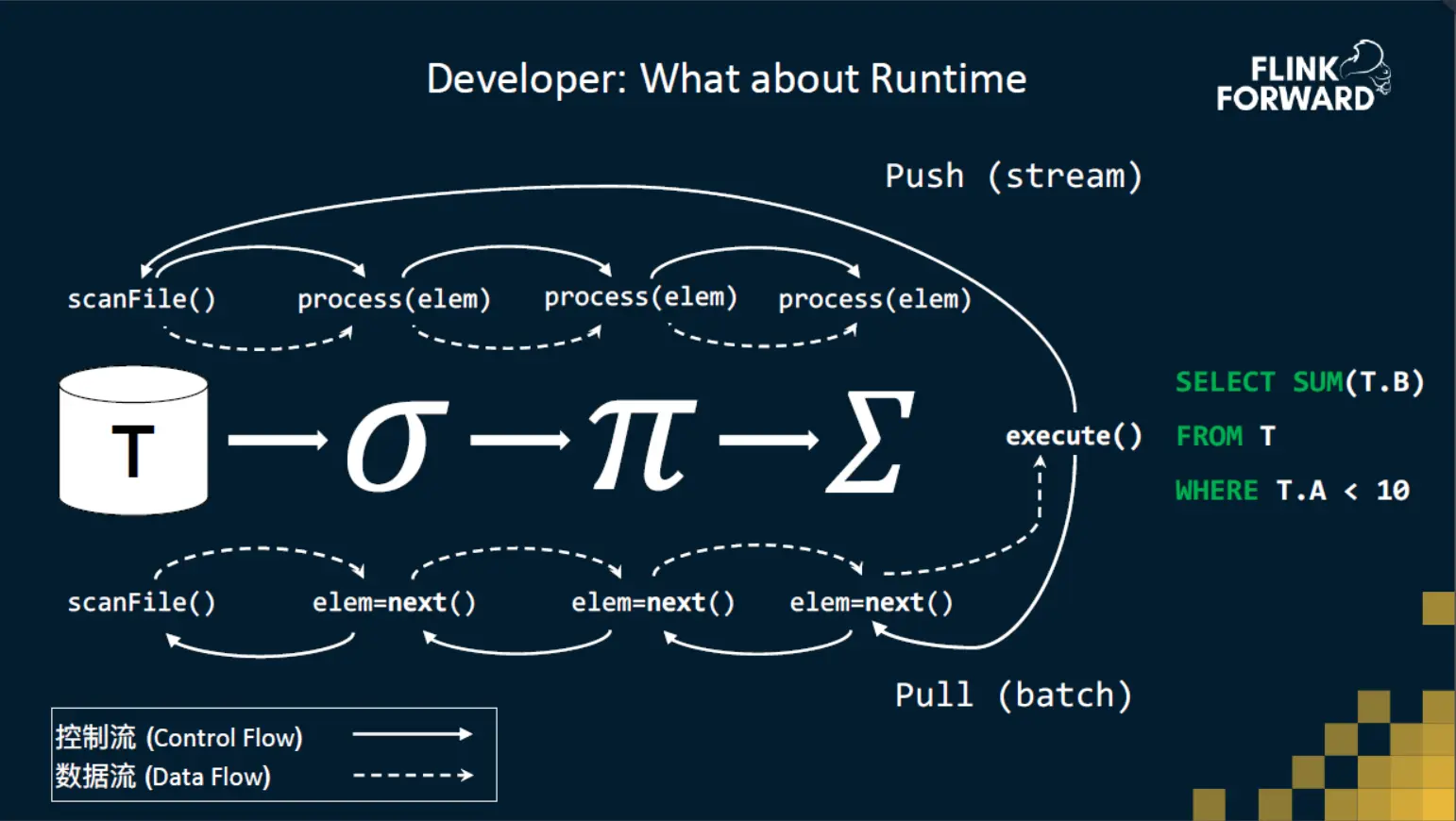 在 push 模式下,在程序开始执行的时候,我们会直接找到 DAG 的头节点,所有的数据和控制消息都由这个头节点往下发送,控制流会跟数据流一起,相当于它同时做一个函数调用,并且把数据发送给下一个算子,最终达到求和的算子。