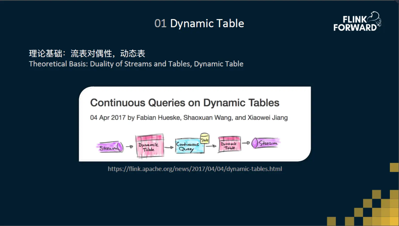 首先,大家已经越来越认同 SQL 是大数据处理的通用语言,不仅仅是因为 SQL 是一个非常易于表达的语言,还因为 SQL 是一个非常适合于流批统一的语言。但是在传统的 SQL 里面,SQL 是一直作用在“表”上的,不是作用在“流”上的。怎么样让 SQL 能够作用在流上,而且让流式 SQL 的语义、结果和批一样呢?这是我们遇到的第一个问题。为了解决这个问题,我们和社区提出了“流表对偶性”还有“动态表”的这两个理论基础。在这里,这个理论基础我们这里就不展开了,感兴趣的同学可以去官网上阅读下这篇文章。大家只需要知道只有在基于这两个理论的基础上,流式SQL的语义才能够保证和批的语义是一样的,结果是一样的。