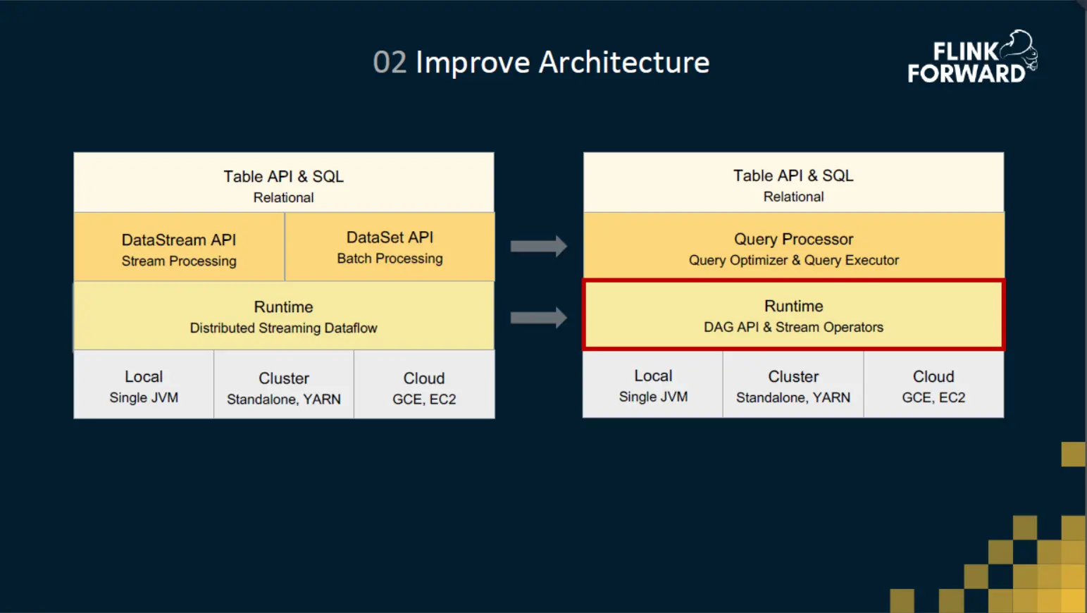 如图是对架构上的一些改进。架构的改进主要集中在中间两层,在 Runtime 层我们增强了现有的 Operator 框架,使得能支持批算子。在 Runtime 之上,我们提出了一个 Query Processor 层,包括查询优化和查询执行,Table API & SQL 不再翻译到 DataStream 和 DataSet ,而是架在 Query Processor 之上。