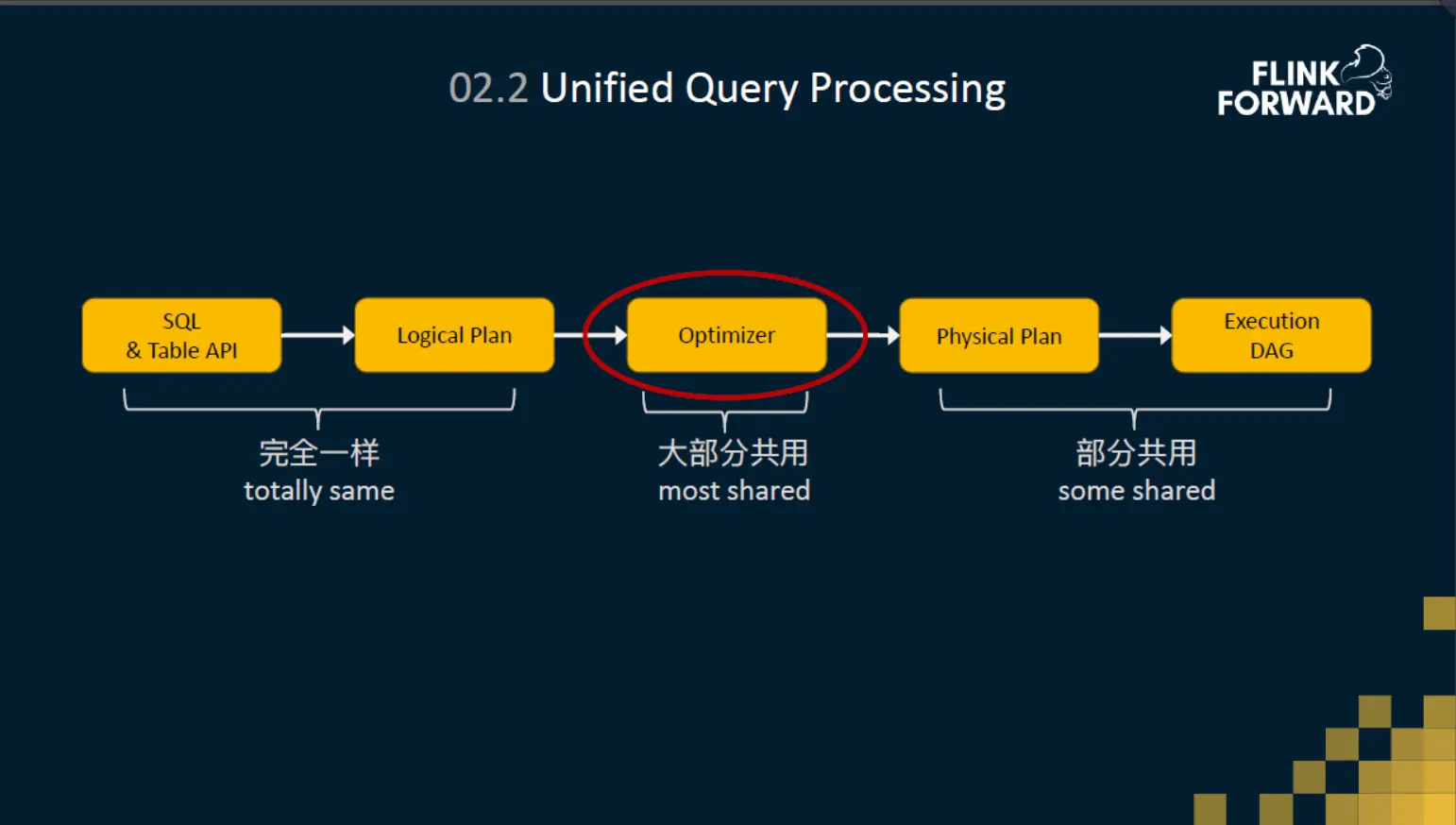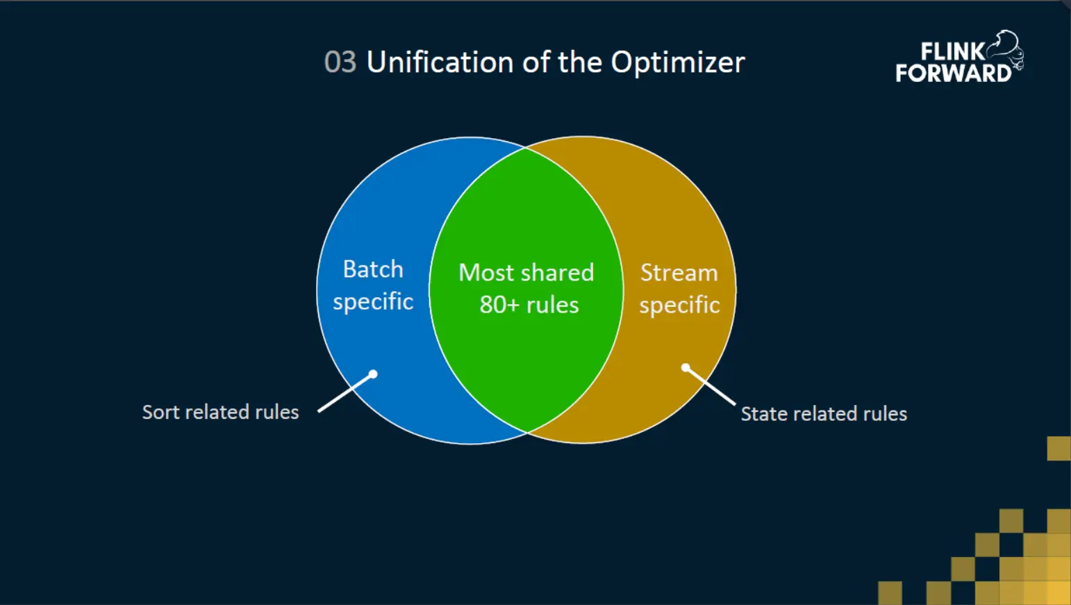 在优化器这一层,很符合二八定律,也就是80%的优化规则都是流和批是共享的,比如说列裁剪、分区裁剪、条件下推等等这些都是共享的。还有20%的优化规则是流批特有的,经过我们的研究发现比较有意思的一个规律。