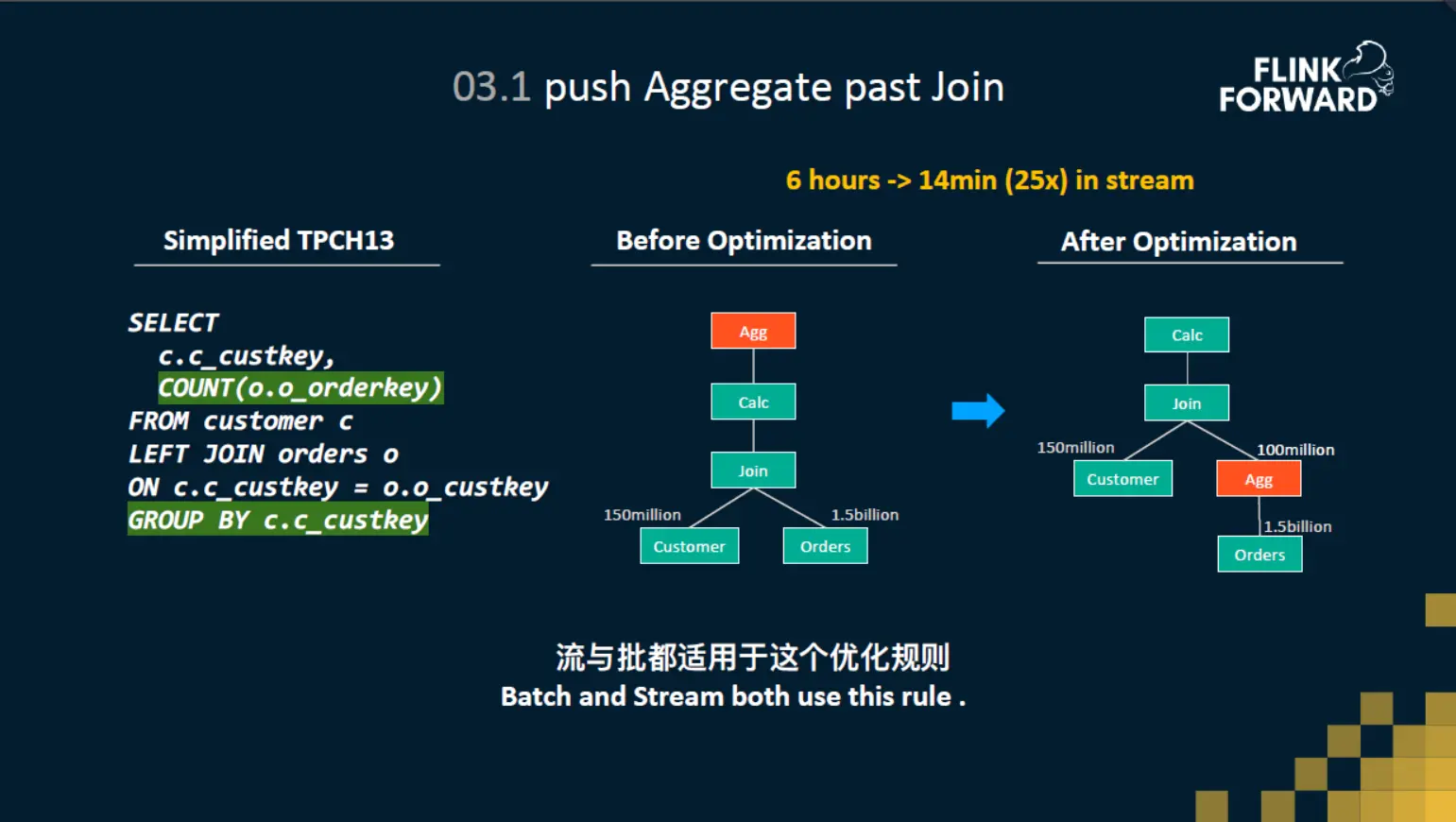 所以说怎样去节省和避免数据量是这个查询优化的方向。我们注意到customer它本身就带了一个主键就是custkey,最后的agg也是针对 custkey 进行聚合统计的。那么其实我们可以先对orders表做一个聚合统计,先统计出每个用户每个custkey它下一个多少的订单,然后再和customer表做一个join,也就是说把agg进行下推,下推到了join之前,这样子,orders表就从原来的15亿的数据量压缩到了一个亿,然后再进行join。这个对于流和批都是巨大的性能优化。我们在流场景下测试发现从原先耗时六个小时提升到了14分钟。