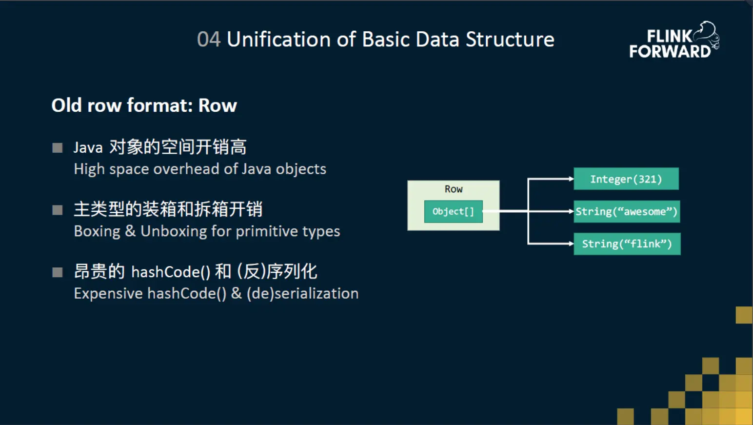 原先在 Flink 中不管流还是批,具体干活的算子之间传递的都是一种叫 Row 的数据结构。 但是Row有这么几个比较典型的问题。