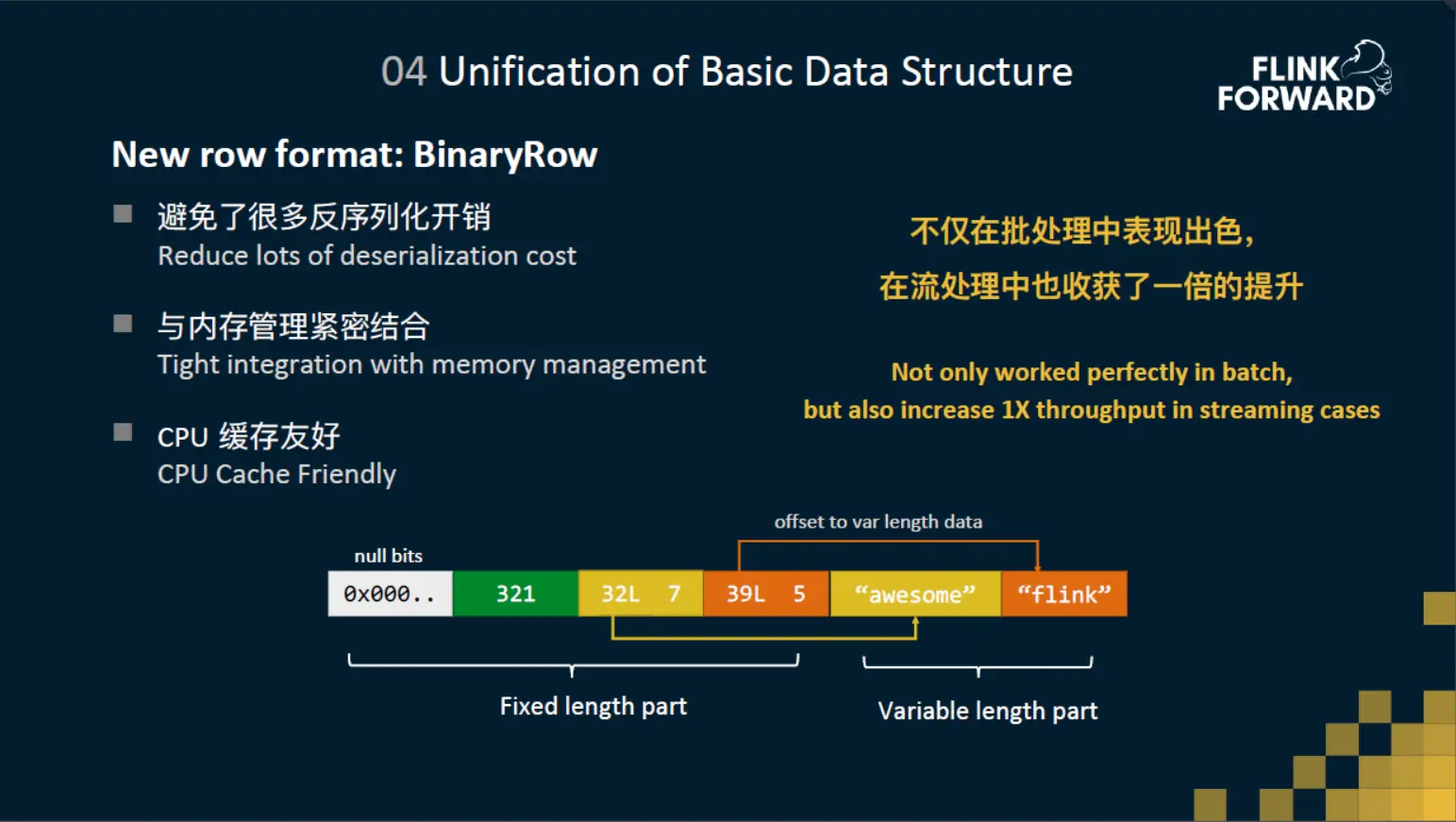 BinaryRow 有一个比较重要的优点:延迟反序列化。例如从网络过来的二进制数据、从state拿到的二进制数据,不会马上反序列化出来,而是会 wrap 成 BinaryRow,当需要的时候才进行反序列化,这能节省很多不必要的反序列化操作,从而提升性能。经过测试,这个数据结构不仅在批处理中表现的非常优秀,在流处理中也得到了一倍的性能提升。